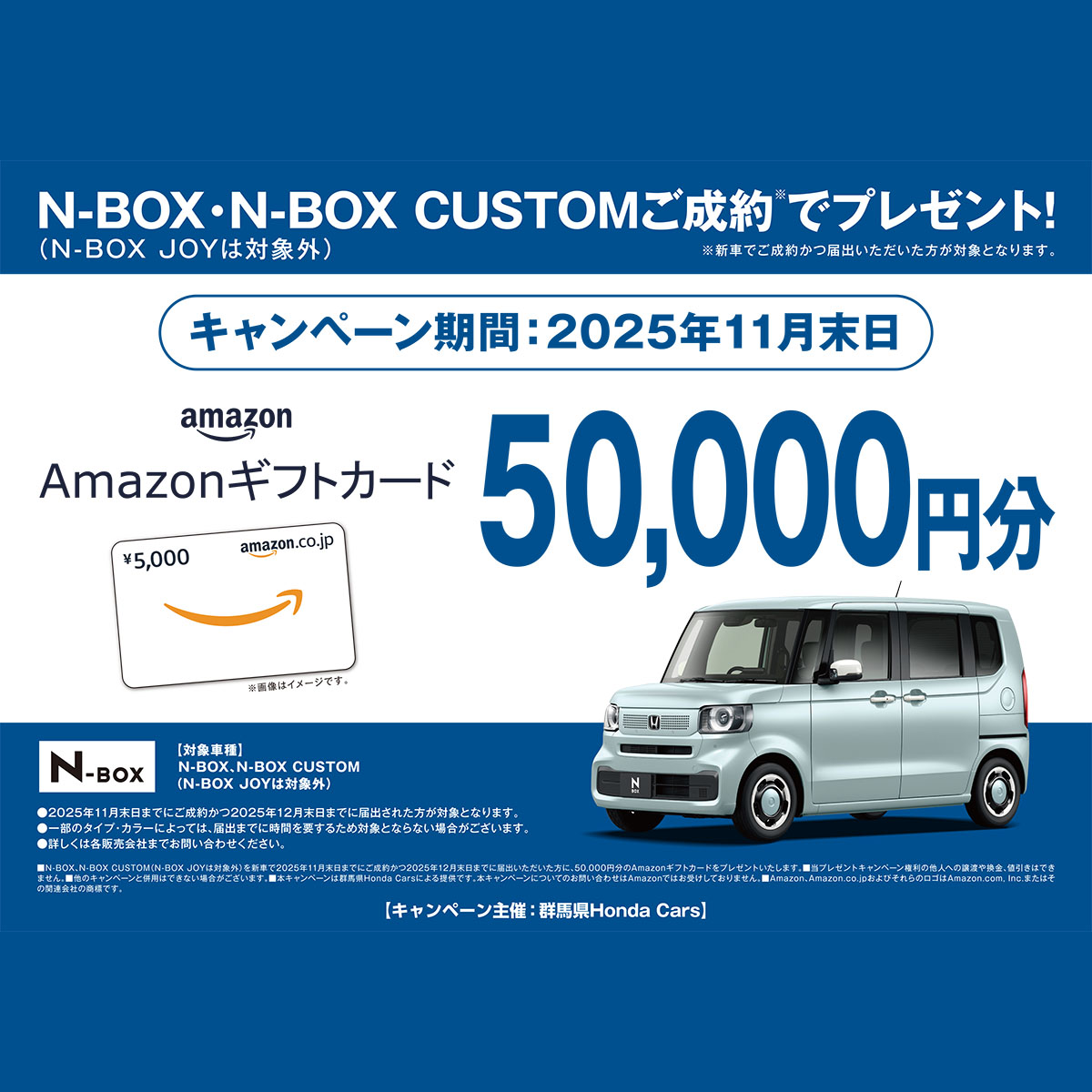 キャンペーンお知らせN-BOX・N-BOX CUSTOMの新車をご成約かつ届出でAmazonギフトカード5万円分プレゼント!